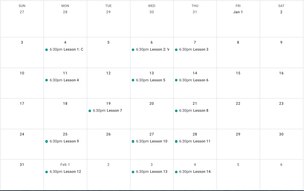 - Monday, January 11th, 6:30-8pm EST – Lesson 4